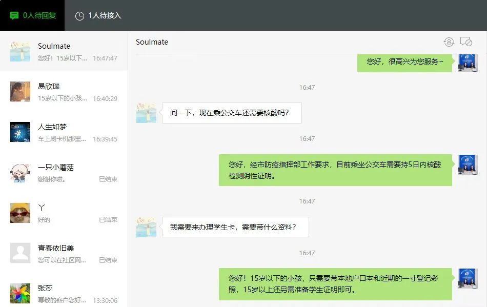 8月份升級(jí)開(kāi)通網(wǎng)絡(luò)人工客服,市民通過(guò)荊門(mén)公交微信公眾號(hào),與人工客服1號(hào)、2號(hào)坐席進(jìn)行溝通,建立起集咨詢(xún)、尋物、建議、投訴等一體化的綜合在線(xiàn)服務(wù)。