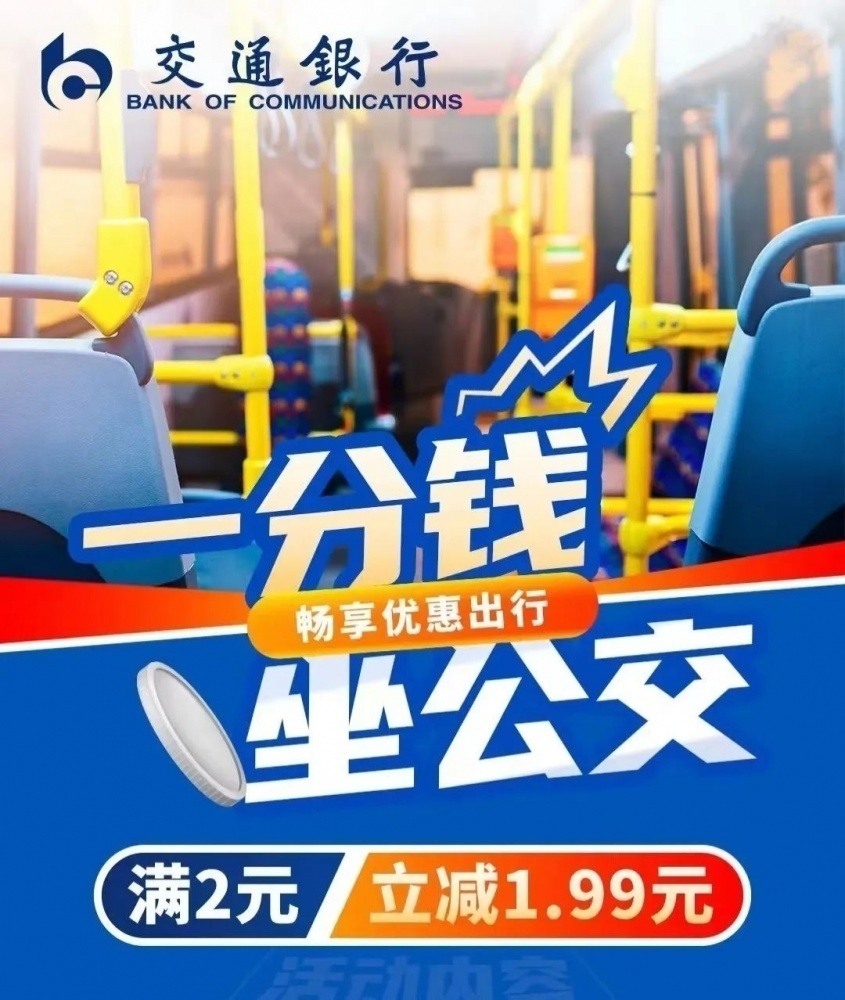 使用交通銀行手機(jī)APP出示付款碼乘車可享滿2元立減1.99元優(yōu)惠。活動總名額10000個,單用戶每日可享受1次優(yōu)惠,每月可享受10次優(yōu)惠,名額有限,先到先得。