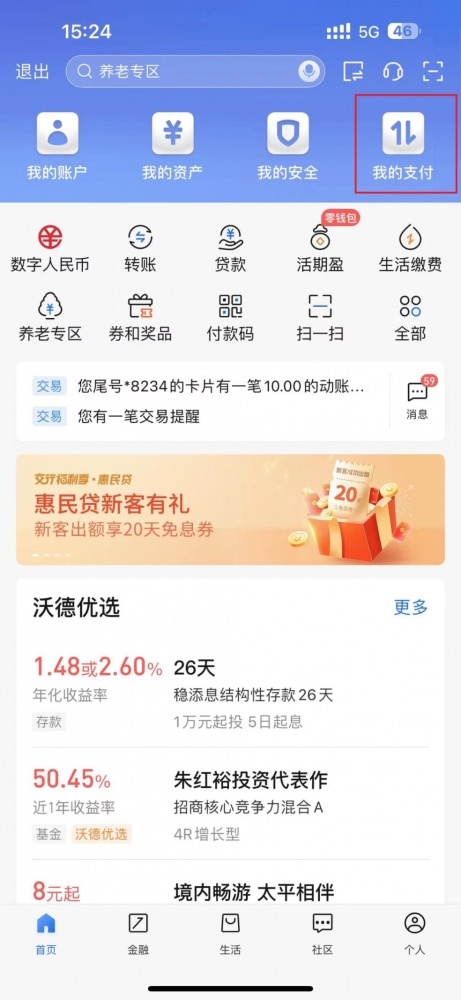 第一步:登錄交通銀行手機(jī)銀行APP-首頁-我的支付-付款碼