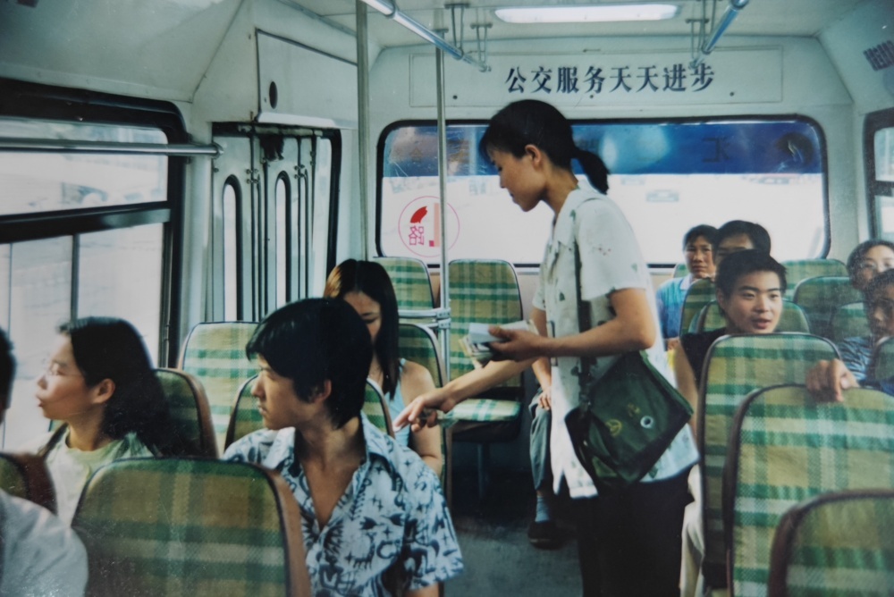 ▲90年代,公交售票員工作模樣。挎著票包,手中拿著零錢和車票,收錢、找錢、給票、查票行云流水。高峰期數(shù)十人上下車,想要收好票款,無疑是一種考驗,而她們久經(jīng)考驗。