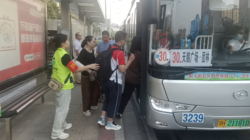 開學(xué)當(dāng)天,人流大、車輛多,在城區(qū)各個學(xué)校附近,公交志愿者身穿綠馬甲或是佩戴安全袖章,守候在關(guān)鍵路口、站臺和斑馬線,面帶笑容引導(dǎo)學(xué)生安全出行。
