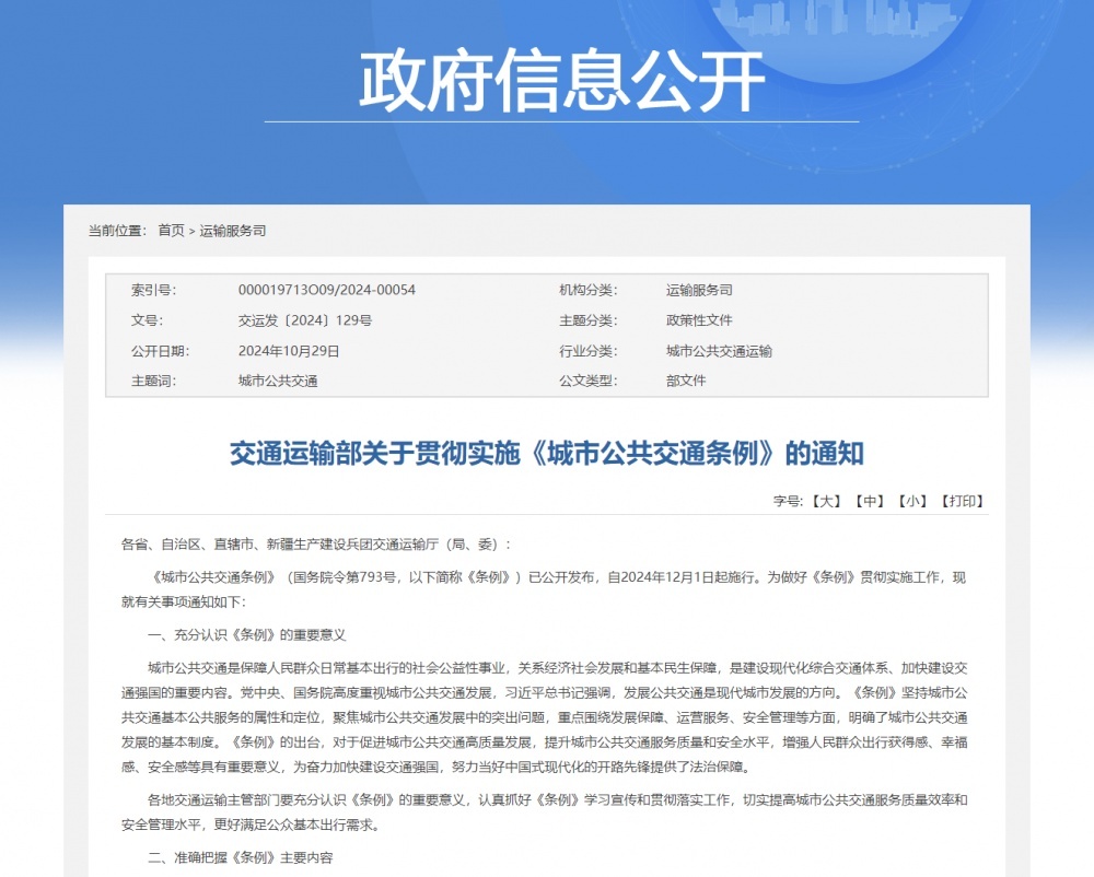 10月29日,交通運(yùn)輸部網(wǎng)站發(fā)布《關(guān)于貫徹實(shí)施〈城市公共交通條例〉的通知》。通知提到,從充分認(rèn)識(shí)《條例》的重要意義、準(zhǔn)確把握《條例》主要內(nèi)容、有力保障《條例》落地實(shí)施來貫徹實(shí)施。